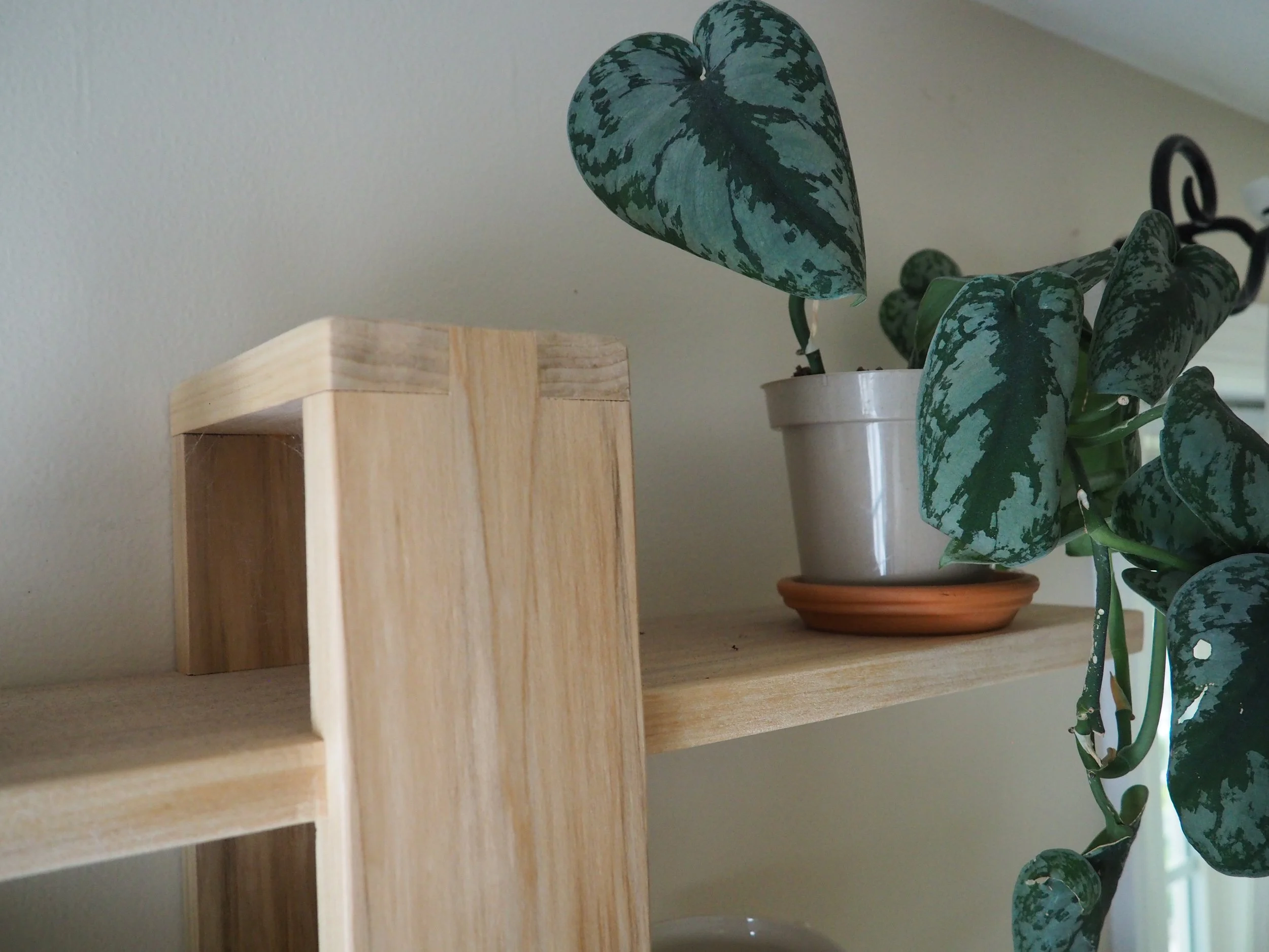 A simple build yet a beautiful piece, the light tone of this poplar offset shelving unit builds contrast to the greenery placed on it. Box joints hold the vertical section together, with dado slots holding each shelf in place. Two keyhole slots on the back of the piece hold it flush to the wall, and prevents tilting.
