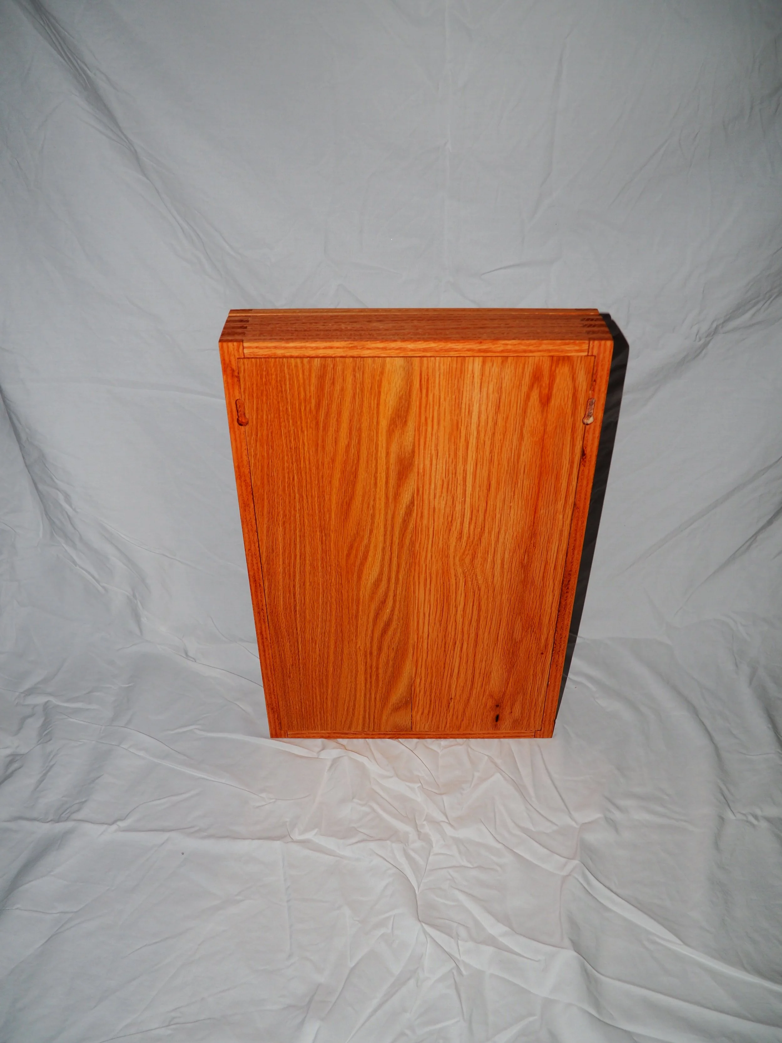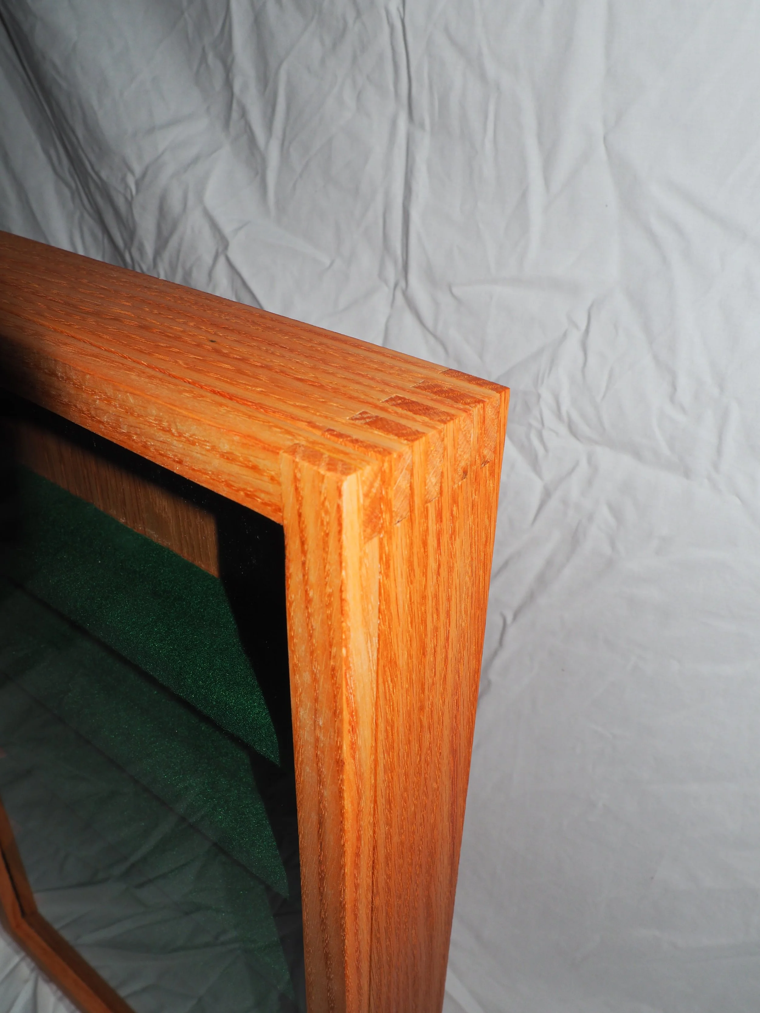 A simple yet beautifully crafted display case envisioned by an Army veteran to display mission coins. Made of red oak finished in tung oil, this piece exhibited a beautiful red hue. Strong box joints at all corners were cut to hold the case together. Shelves lined in a green felt provided color balance. Recessed magnets were utilized to hold the door in place. Keyhole slots on the back of the piece provided easy hanging and a flush fit against a wall.