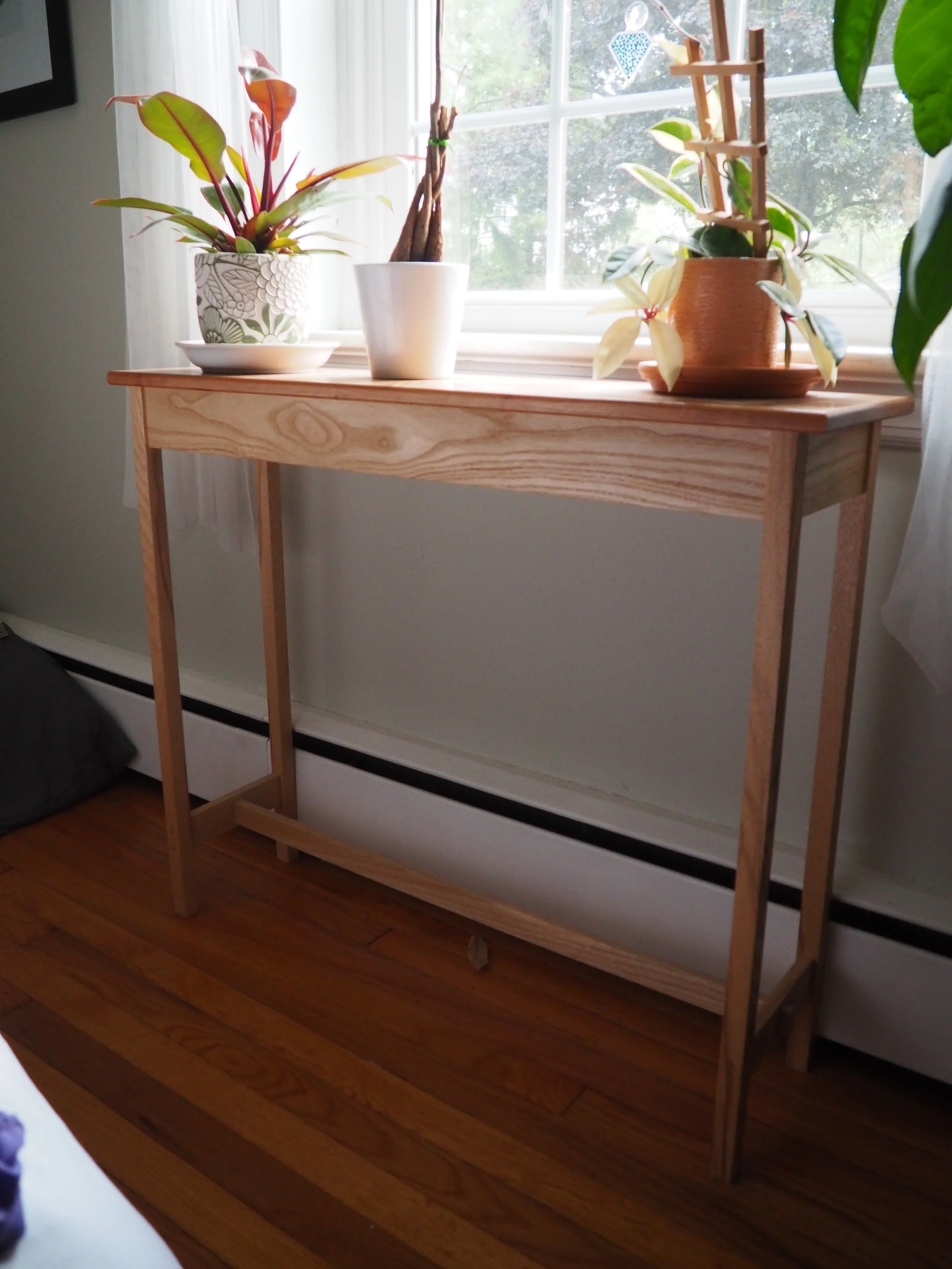 Two woods were used to make this minimalist style console table. Cherry on the top and ash for the body, this piece presents a unique dual tone look of red and blonde. The ash exhibits stunning grain structure that can be seen on both the body and legs. Small dowels and mortise and tenon at the base of the legs provide stability.